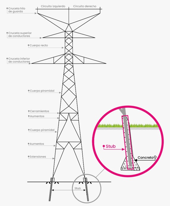 Los stubs corresponden a piezas utilizadas en las fundaciones de las torres de transmisión y cumplen una función esencial de anclaje entre la obra civil y la estructura metálica.